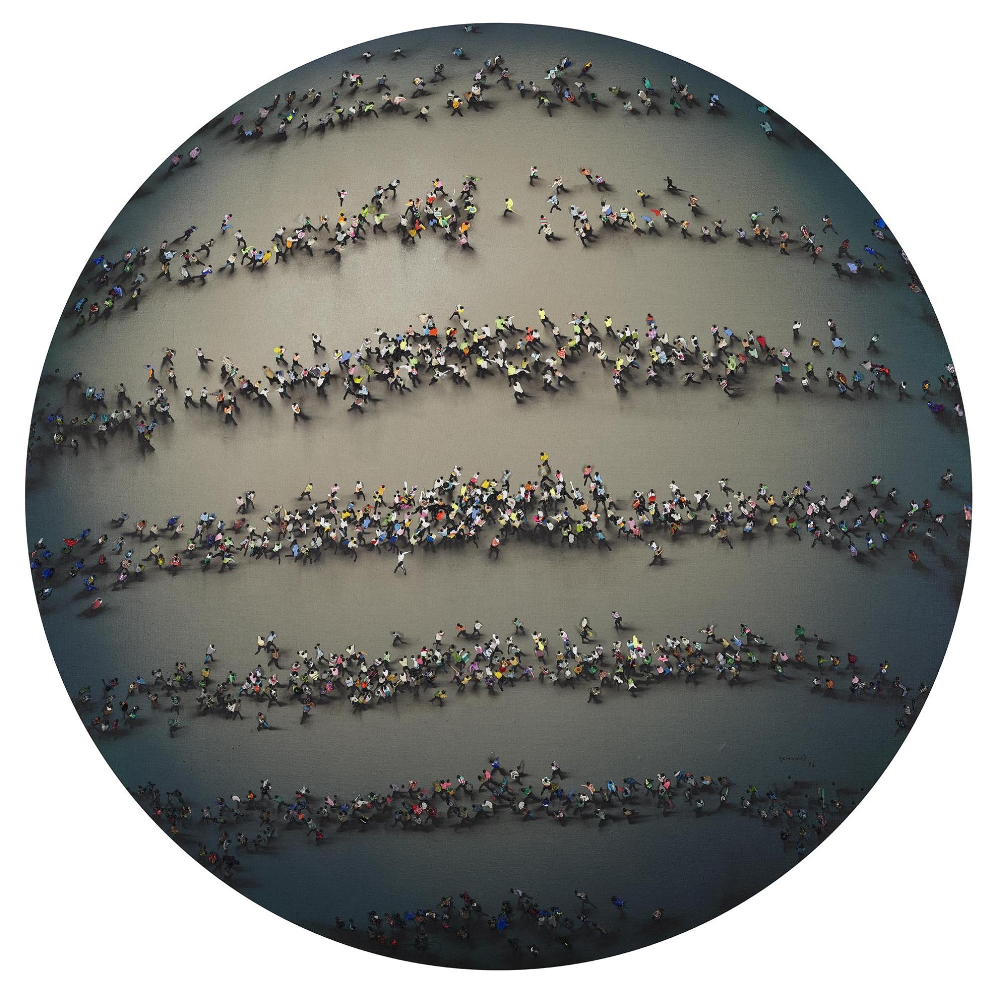 Dans les années 1960, son œuvre prend une dimension résolument politique. Les foules, les attroupements, les masses compactes de personnes anonymes deviennent ses motifs emblématiques. Ces silhouettes vues d’en haut, semblant se déplacer, se rassembler ou fuir, traduisent aussi bien l’espoir que l’oppression, la solidarité que la fragilité des corps face à la violence du pouvoir. Son tableau El Abrazo, devenu une image iconique de la transition démocratique espagnole, incarne parfaitement cette tension entre douleur partagée et désir collectif d’avenir.