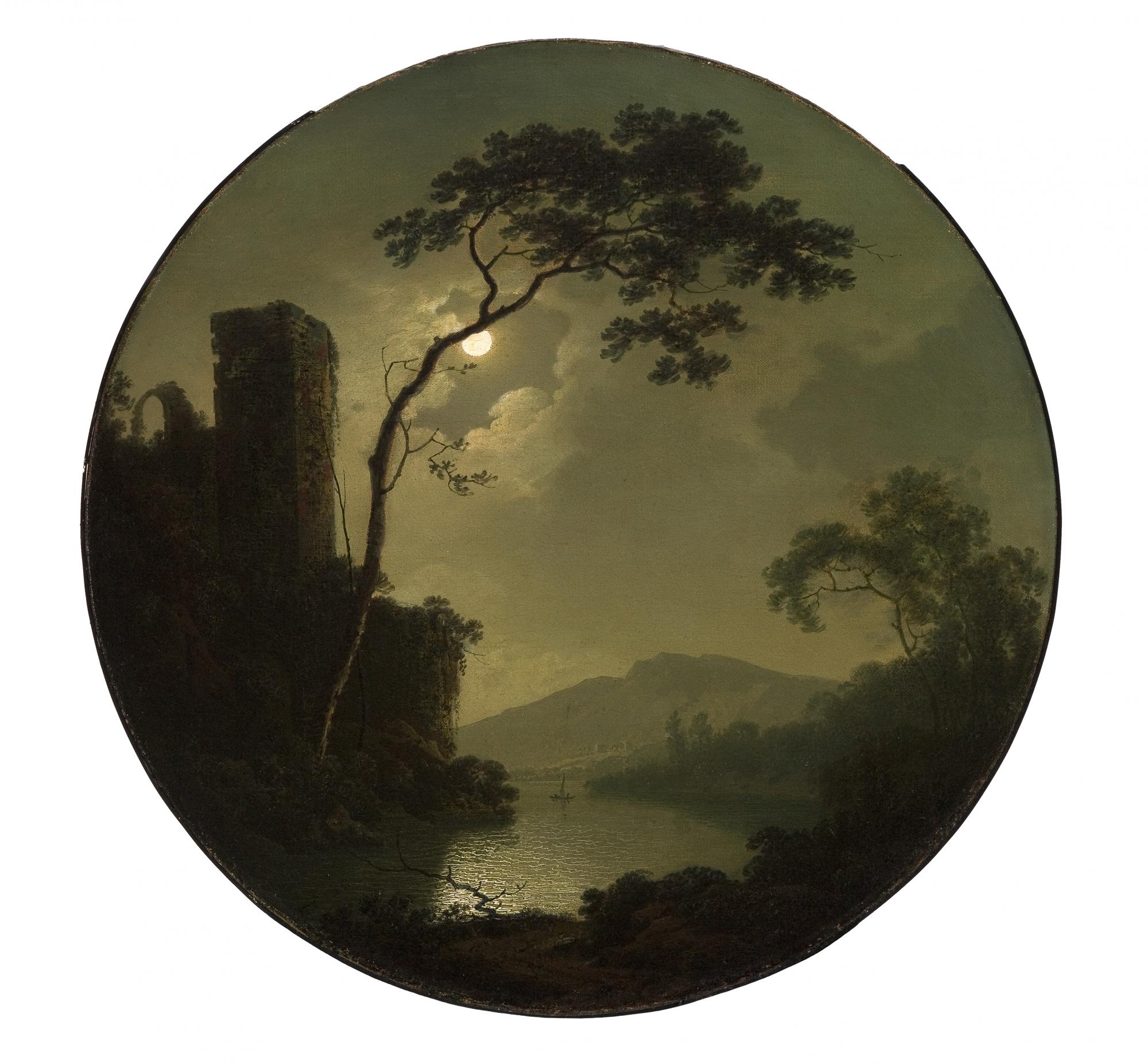 - Joseph Wright of Derby (1734-1797), Lac avec un château sur une colline, huile sur toile, 1787, domaine public, Saint Louis Art Museum.
